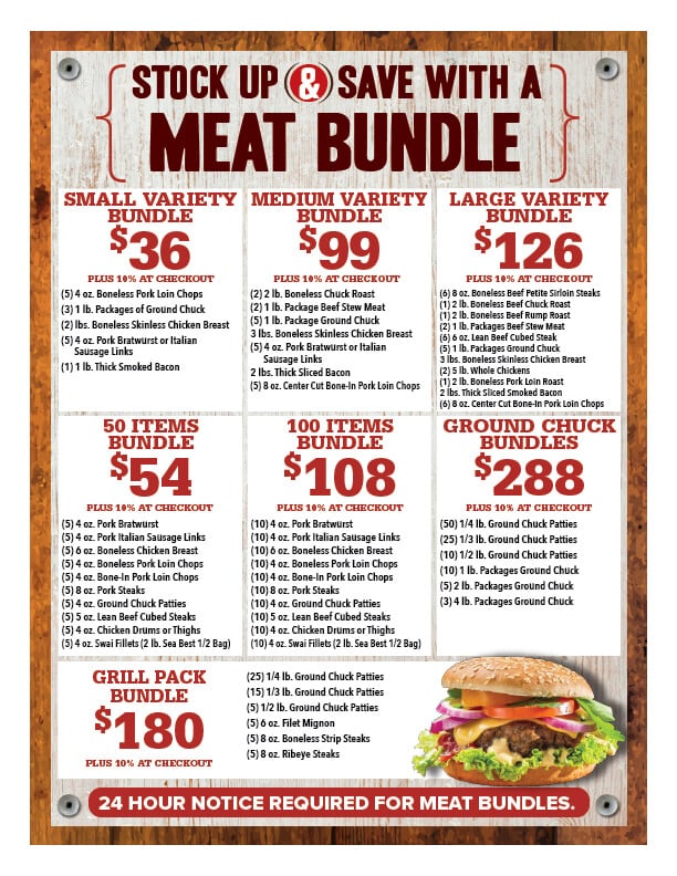 24 hour notice required for meat bundles; please call your store to order. Click to find your store Add a Bundle to your cart now!