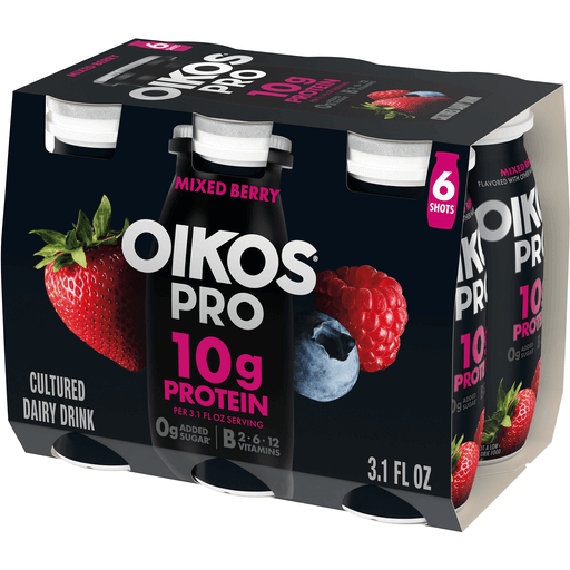 Oikos Pro Shots Mixed Berry Cultured Dairy Drinks pack a punch with 10g protein per 3.1 fl oz serving to help fuel your muscles and contain complete protein (all nine essential amino acids). Oikos Pro Shots are a good source of vitamin D and calcium for strong bones, and B vitamins (B2, B6, B12) muscles use to support energy production. This dairy drink contains 0g added sugar* per serving and no artificial flavors or colors from artificial sources. Convenient for adding complete protein to your diet every day, these on the go snacks are great for professionals, students and athletes looking for post workout snacks or an addition to protein shakes and smoothies.
