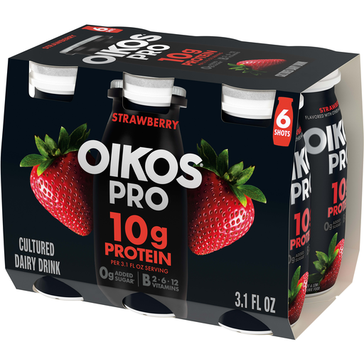Oikos Pro Shots Strawberry Cultured Dairy Drinks pack a punch with 10g protein per 3.1 fl oz serving to help fuel your muscles and contain complete protein (all nine essential amino acids). Oikos Pro Shots are a good source of vitamin D and calcium for strong bones, and B vitamins (B2, B6, B12) muscles use to support energy production. This dairy drink contains 0g added sugar* per serving and no artificial flavors or colors from artificial sources. Convenient for adding complete protein to your diet every day, these on the go snacks are great for professionals, students and athletes looking for post workout snacks or an addition to protein shakes and smoothies.